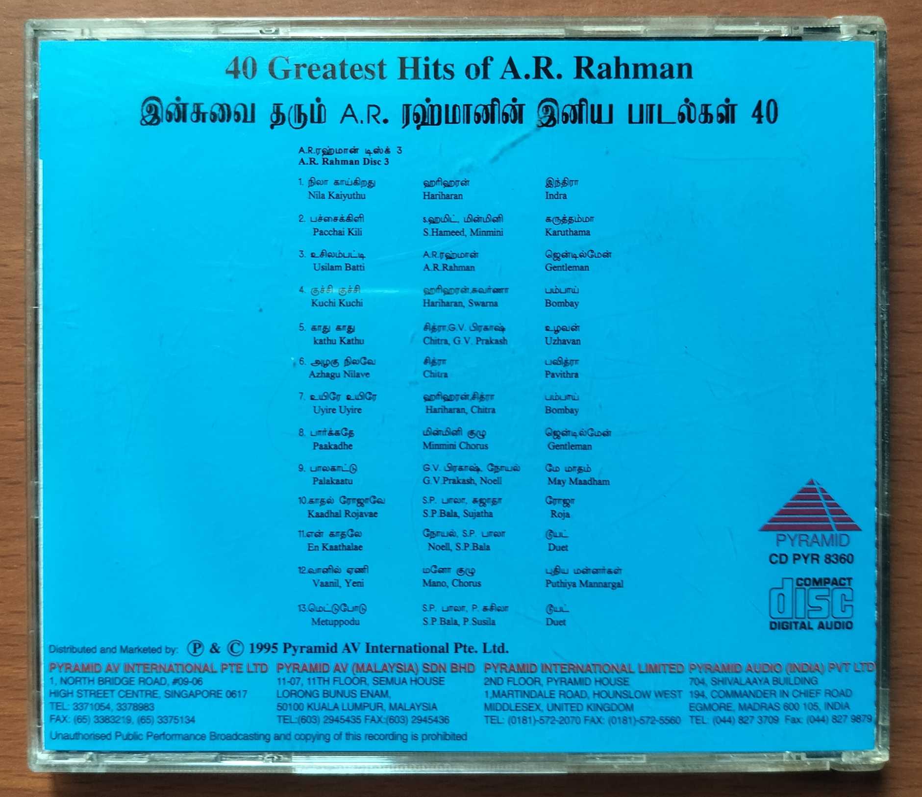 40 GREATEST HITS BY A.R. RAHMAN DISC. 3 – A.R. Rahman Tamil Gold Collection Audio Cd