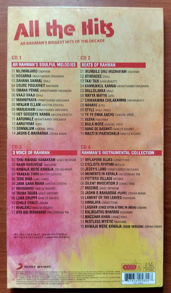 ALL THE HITS AR RAHMAN’S BIGGEST HITS OF THE DECADE – A.R. Rahman Tamil & Hindi Collection 4CD Pack Audio Cd (PREMIUM EDITION PACK)