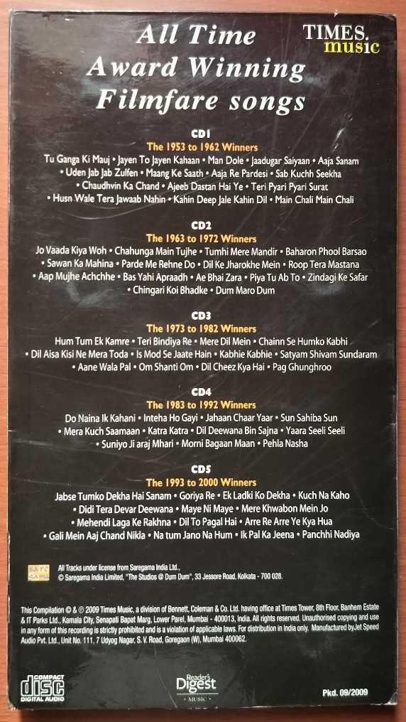 ALL TIME AWARD WINNING FILMFARE SONGS – Hindi 5CD Premium Edition Audio Cd
