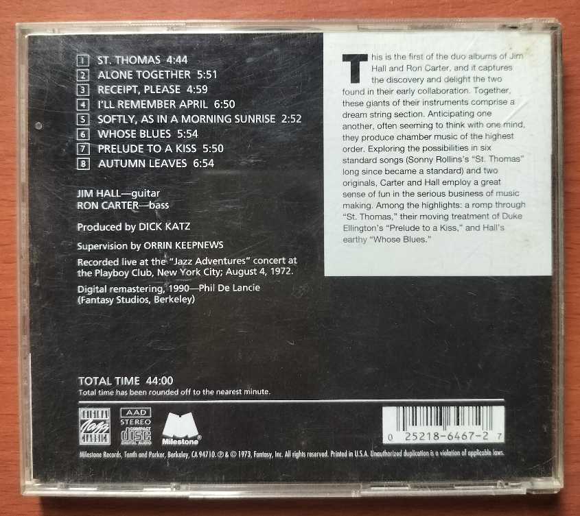 ALONE TOGETHER JIM HALL RON CARTER DUO – Imported Jazz Album Audio Cd