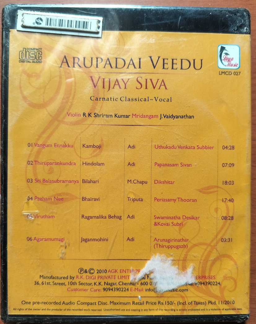 ARUPADAI VEEDU – Vijay Siva Carnatic Classical Vocal Audio Cd (FACTORY SEALED PACK)