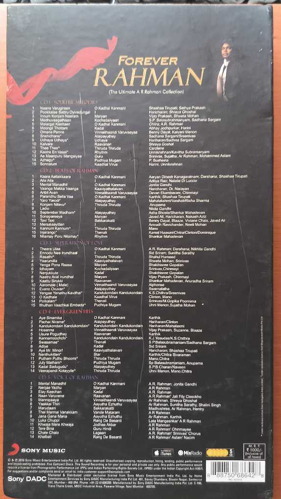 FOREVER RAHMAN THE ULTIMATE A.R. RAHMAN COLLECTION – A.R. Rahman Tamil Film Songs 5 CD Premium Edition Pack Audio Cd (ALAIPAYUTHEY / THIRUDA THIRUDA SONY SONGS PACK)