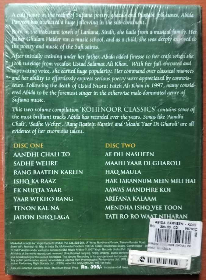 GLORIOUS URDU & SUFI VERSE IMMORTALISED ABIDA PARVEEN KOHINOOR CLASSICAL – Indian Classical 2CD Pack Audio Cd (FACTORY SEALED PACK)