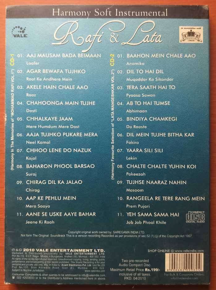 GREAT VALUE PACK CLASSIC RAFI & LATA – Harmony Soft Instrumental 2CD Pack Audio Cd