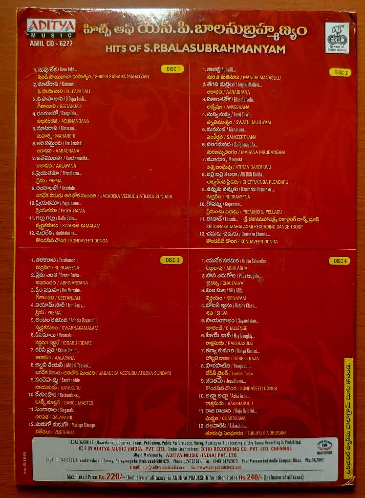 HITS OF S.P.BALASUBRAMANYAM – Telugu S.P.B Collection 4CD Premium Edition Pack Audio Cd