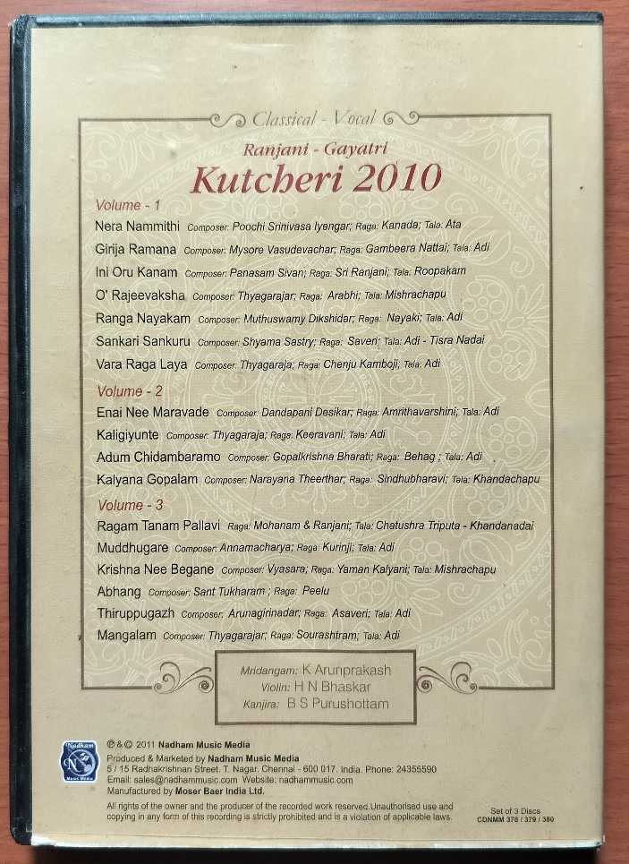 Home » Shop » KUTCBERI 2010 – Ranjani- Gayathri 4 Hour Concert Classical Instrumental 3CD Pack Audio Cd