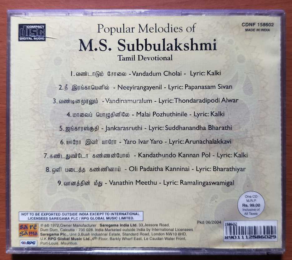 POPULAR MELODIES OF M.S. SUBBULAKSHMI – Tamil Devotional Audio Cd