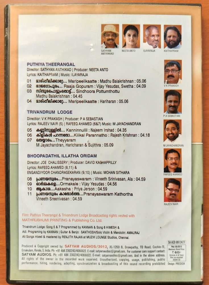 PUTHIYA THEERANGAL / TRIVANDRUM LODGE / BHOOPADATHIL ILLATHA ORIDAM – Ilaiyaraja & Jayachandran Malayalam Audio Cd