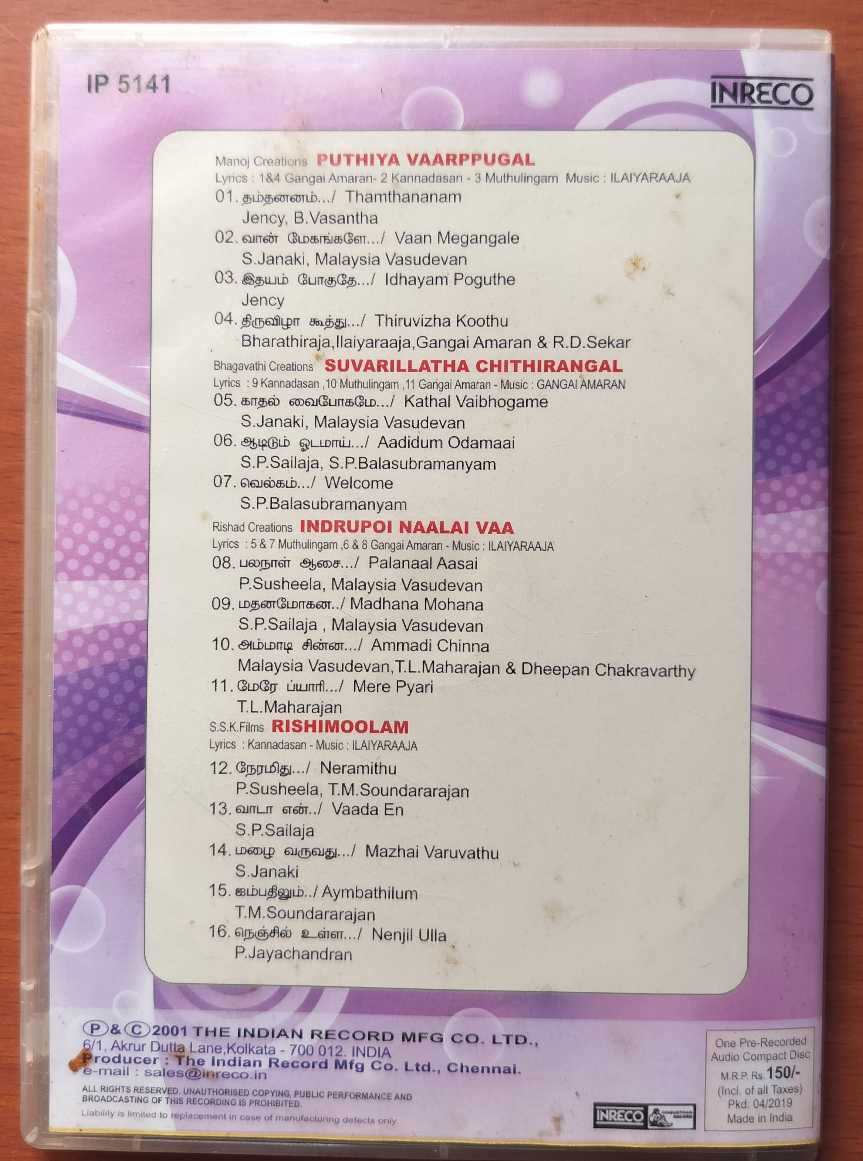 PUTHIYA VAARPPUGAL / SUVARILLATHA CHITHIRANGAL / INDRUPOI NAALAI VAA / RISHIMOOLAM – Ilayaraja Tamil Audio Cd