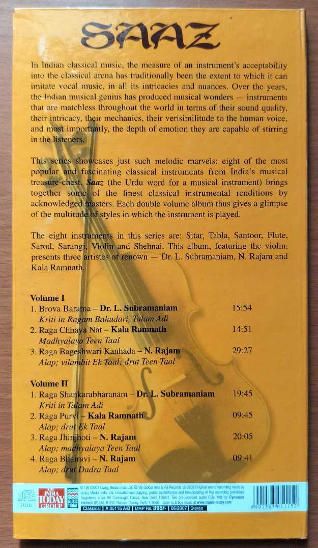 SAAZ VIOLIN – DR. L. Subramaniam & N. Rajan Kala Ramnath Instrumental Premium Edition 2CD Pack Audio Cd