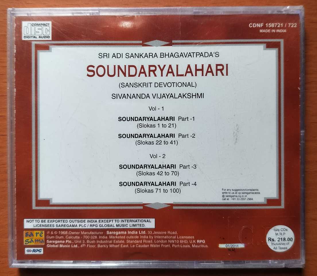 SRI ADI SANKARA BHAGAVATPADA ‘S SOUNDARYALAHARI – Sivananda Vijayalakshmi Sanskrit Devotional 2CD Pack Audio Cd (FACTORY SEALED PACK)