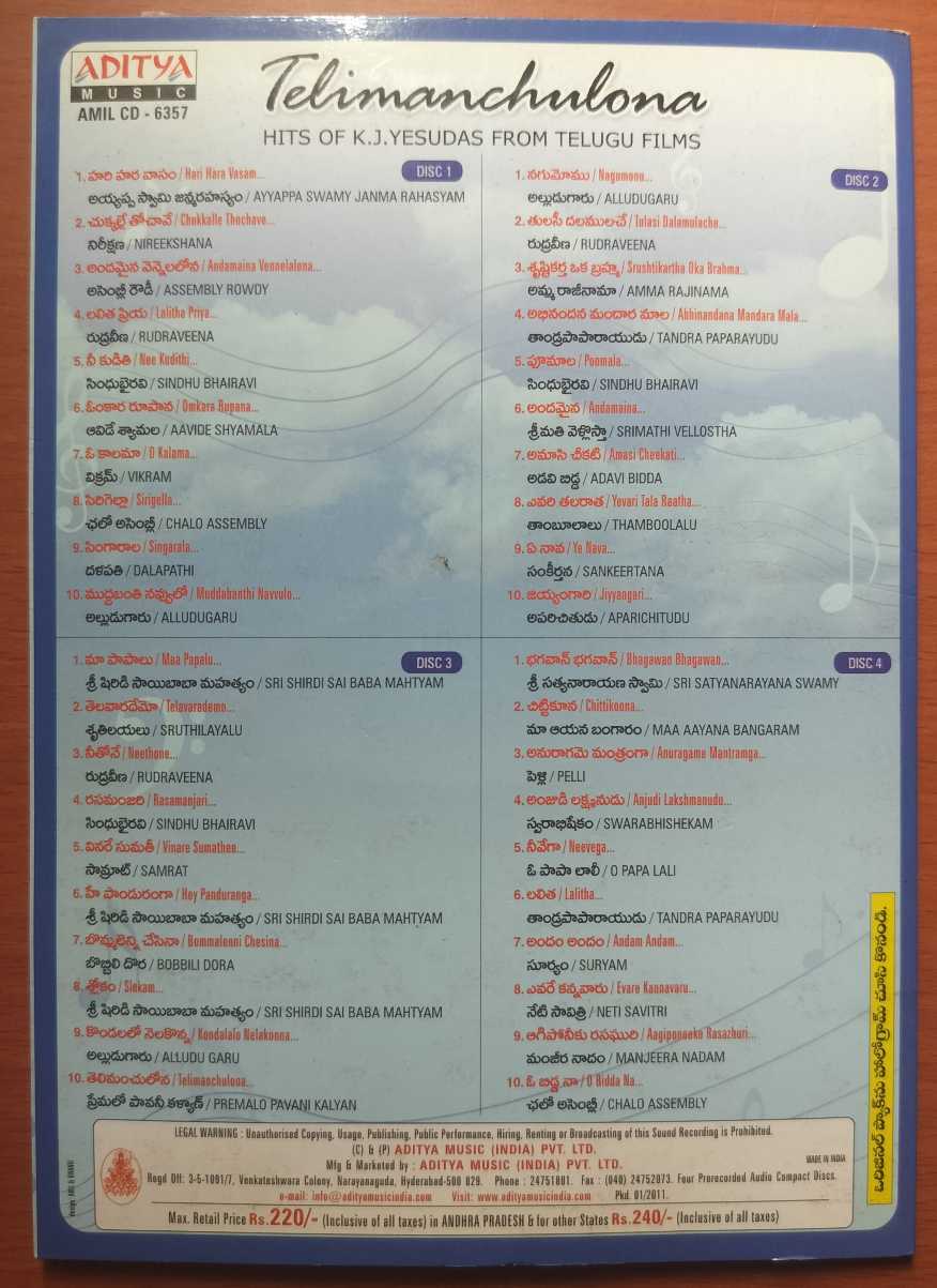 TELIMANCHULONA HITS OF K.J. YESUDAS FROM TELUGU FILMS – Telugu 4CD Premium Edition Pack Audio Cd